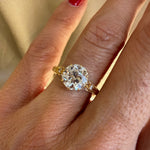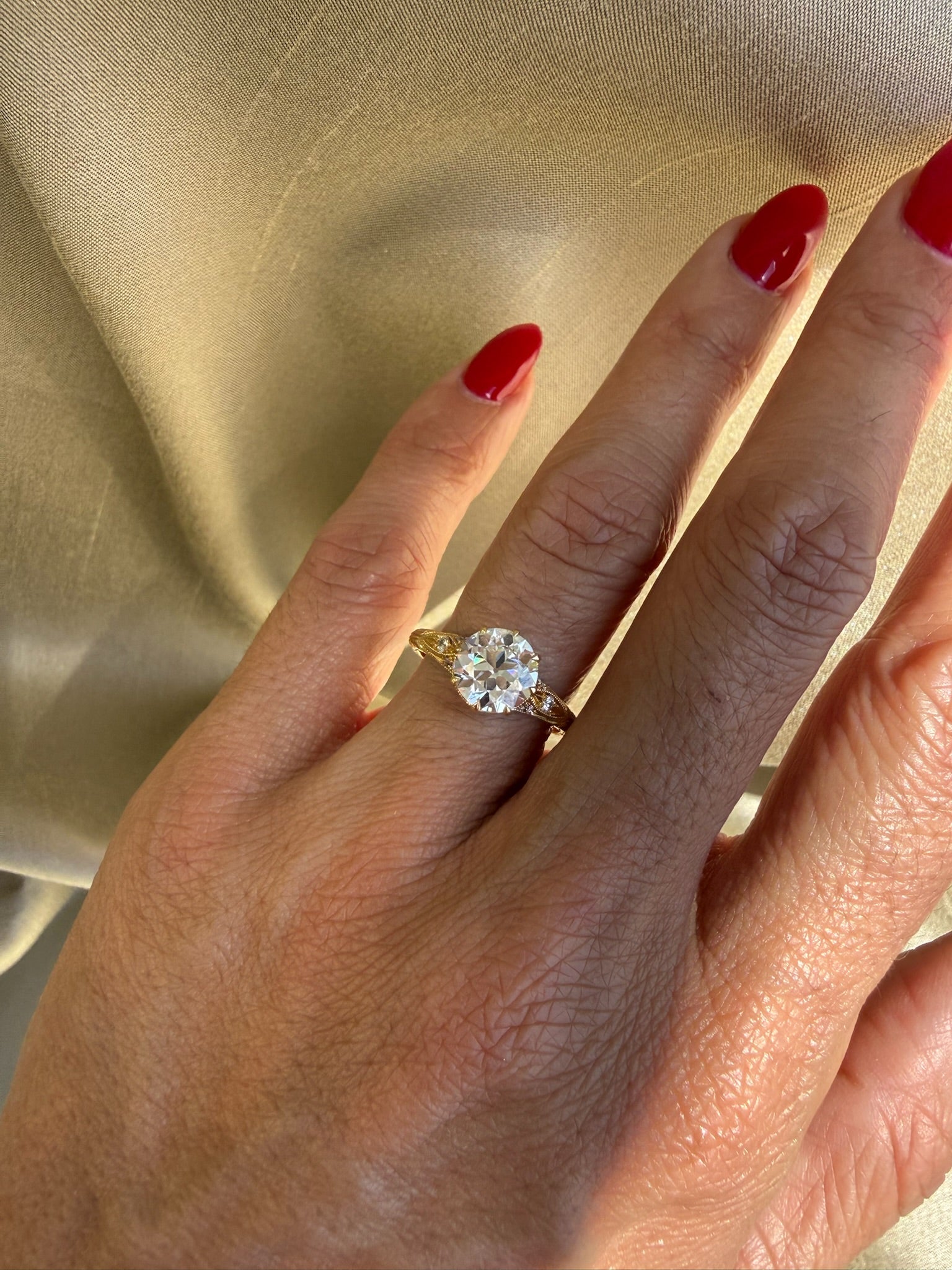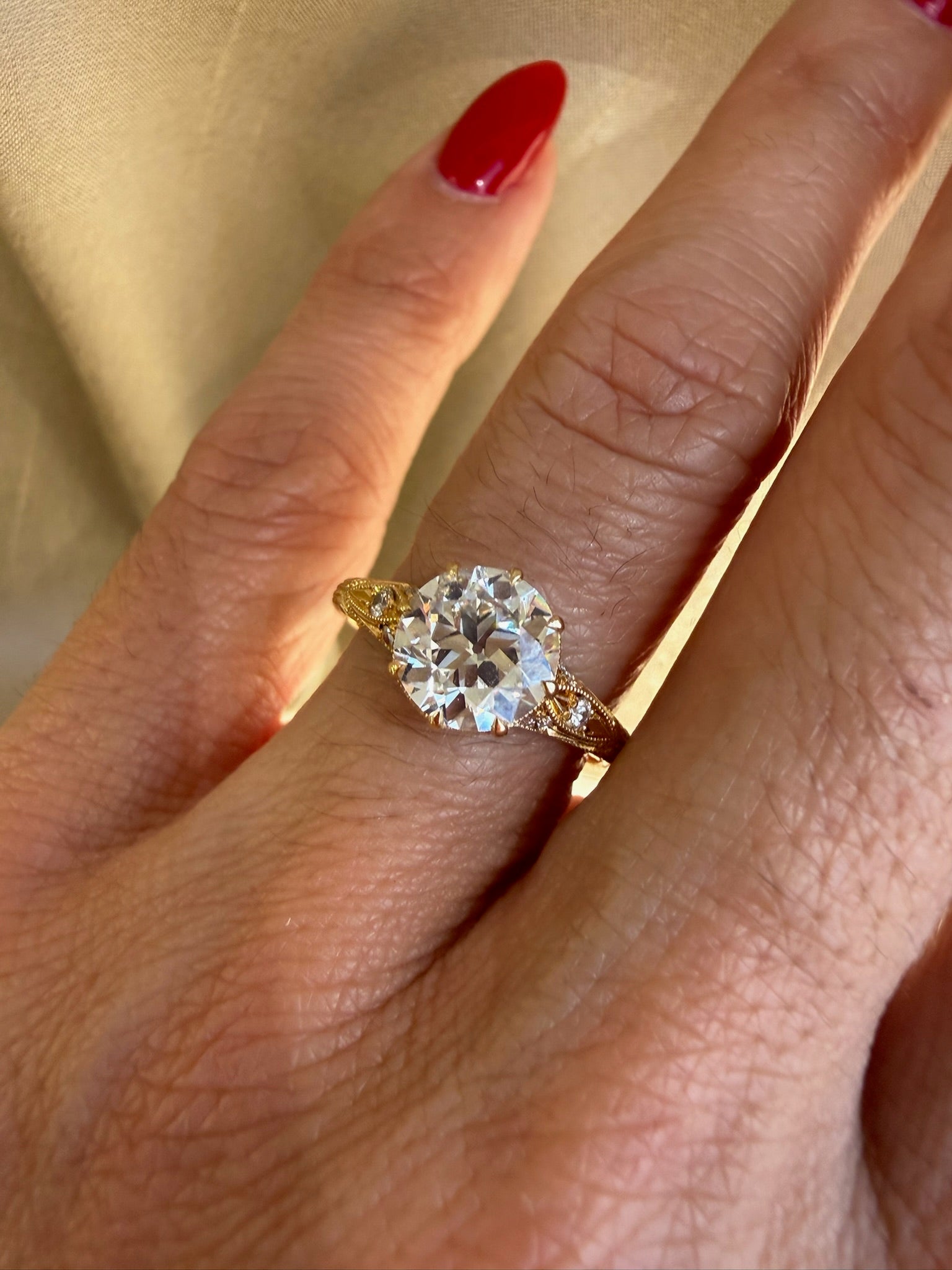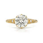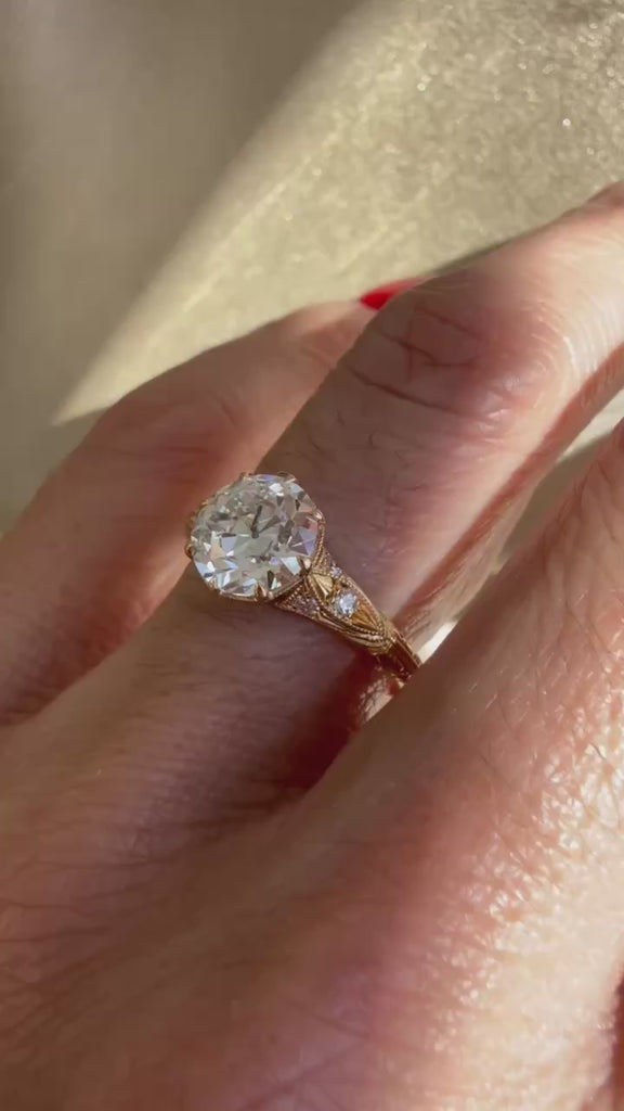 The Nicole Ring showcases a magnificent 1.79ct Old European Cut diamond, cradled by eight precisely crafted claw prongs that honor the stones' elegance. A refined decorative gallery forms the stone's basket, while delicate accent diamonds trace the band in a symphony of light. Hand-carved decorative details along the band reveal the meticulous craftsmanship of master artisans, creating a timeless heirloom worthy of life's most cherished moments.