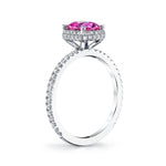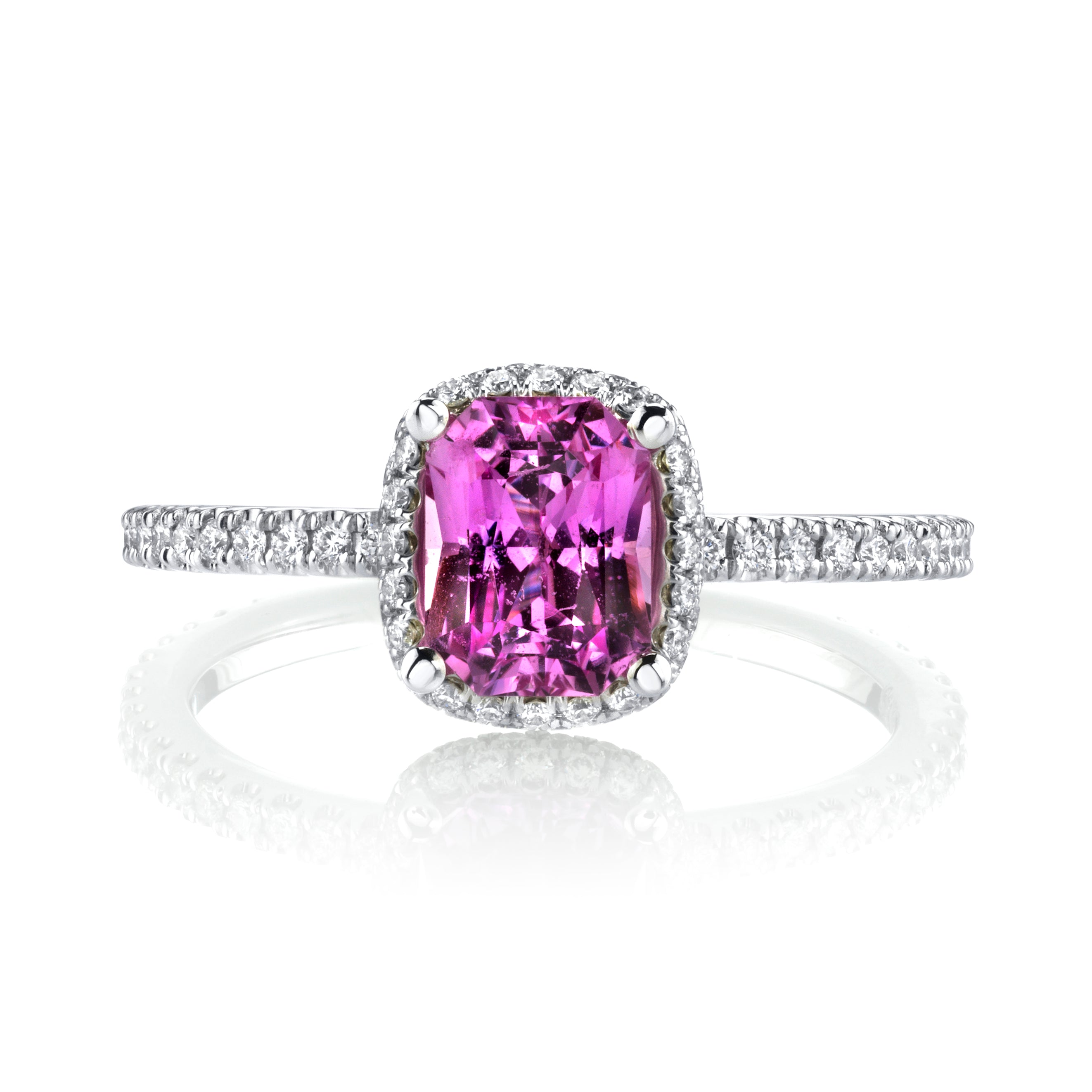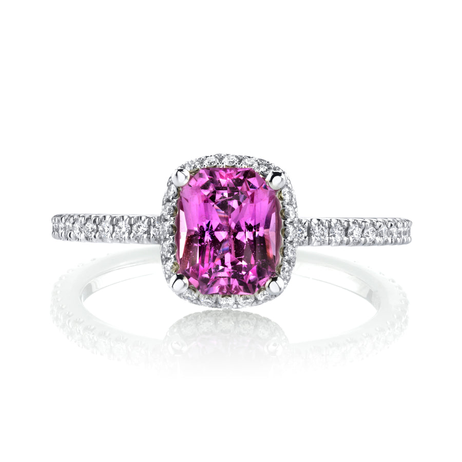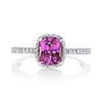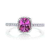 Petite diamond band houses a perfectly pink cushion shaped sapphire surrounded by an elegant micro-pave halo of diamonds. The ring contains 1.59 carats total weight