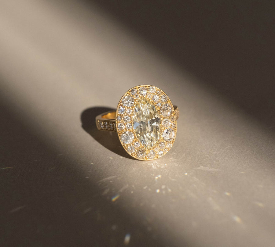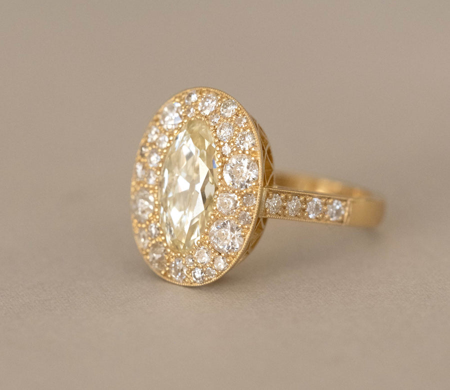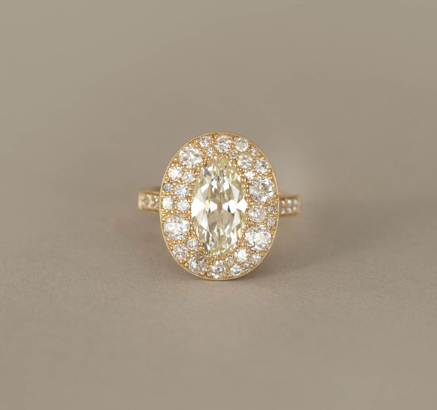 A ring that will stop the show, crafted with unparalleled precision and only capable by a  select few. This 2.02 ct. Moval cut diamond - a rare find - serves as the centerpiece, with an array of old-cut and brilliant-cut diamonds swirling around it.