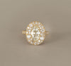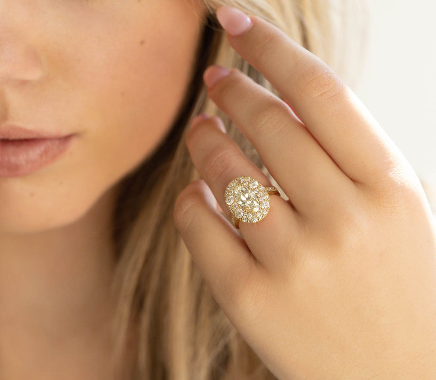 Ideal for the nontraditional engagement ring or a bejeweled heirloom cocktail ring! The center stone has some warmth, but faces up much whiter than it's stated color plus we love the warm charming tones!