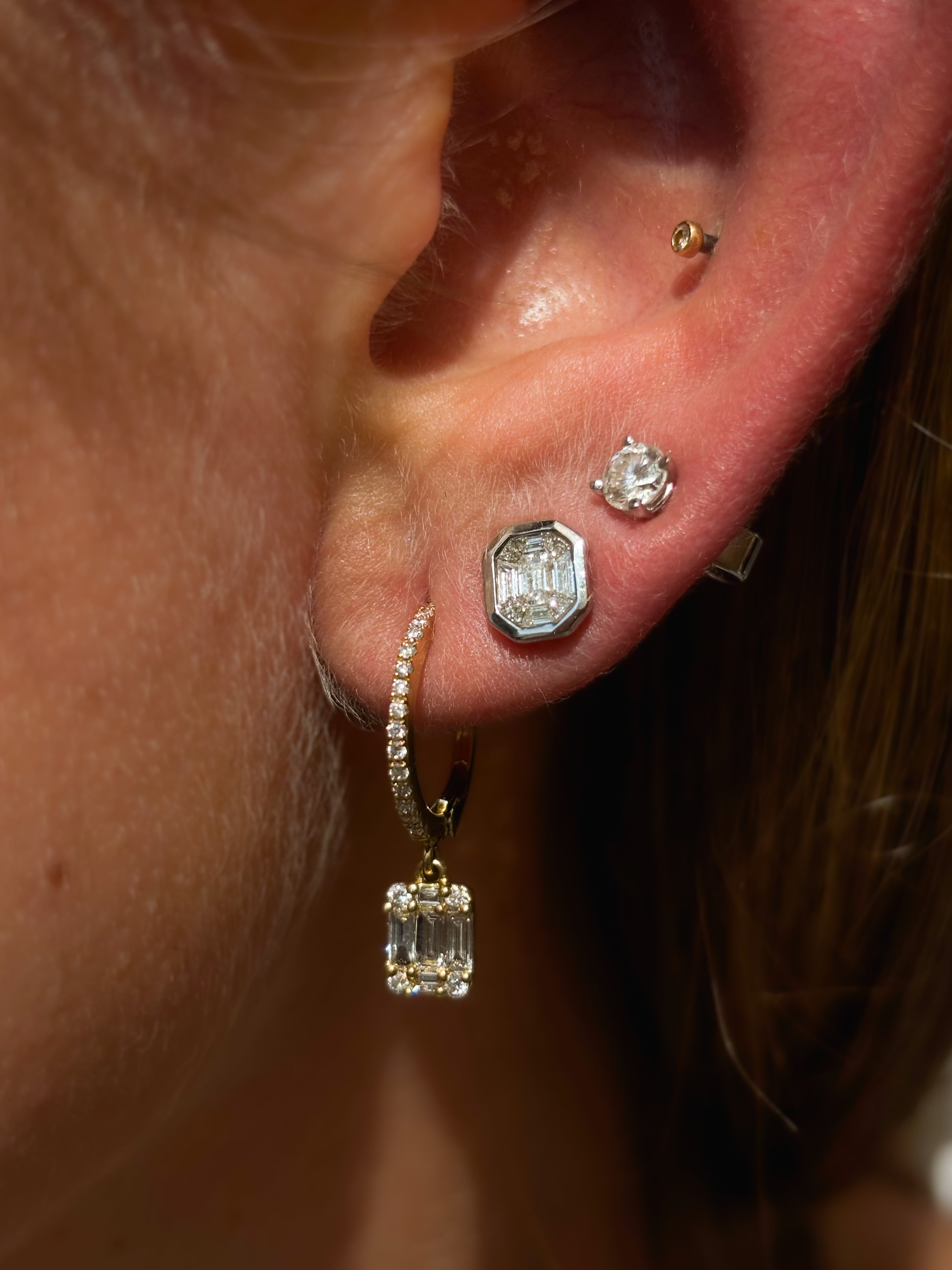 These drop earrings showcase an elegant combination of natural white diamond rounds and baguettes. Designed for the woman who enjoys layering her jewelry, they offer a refined touch to any ear stack.
