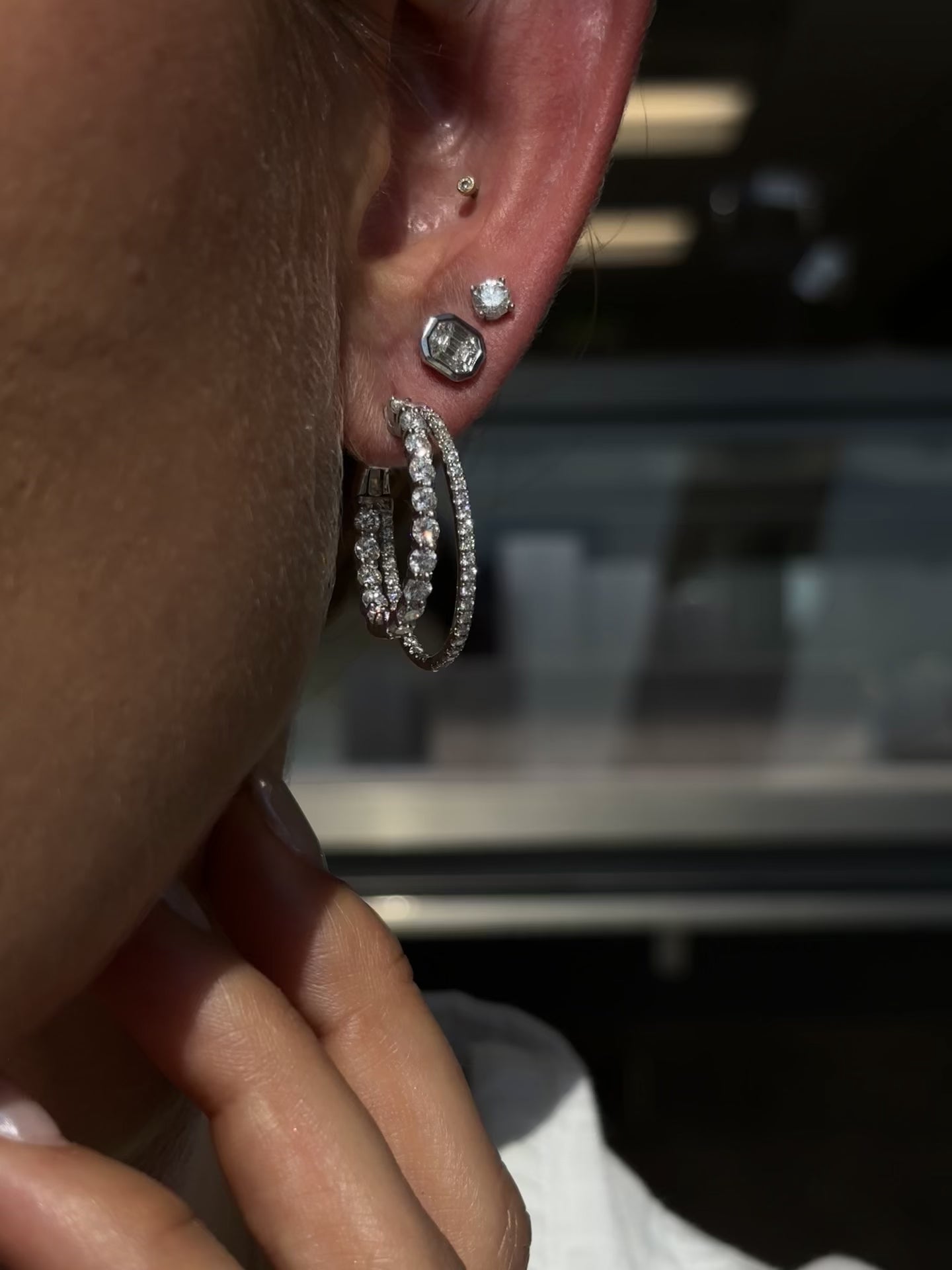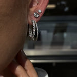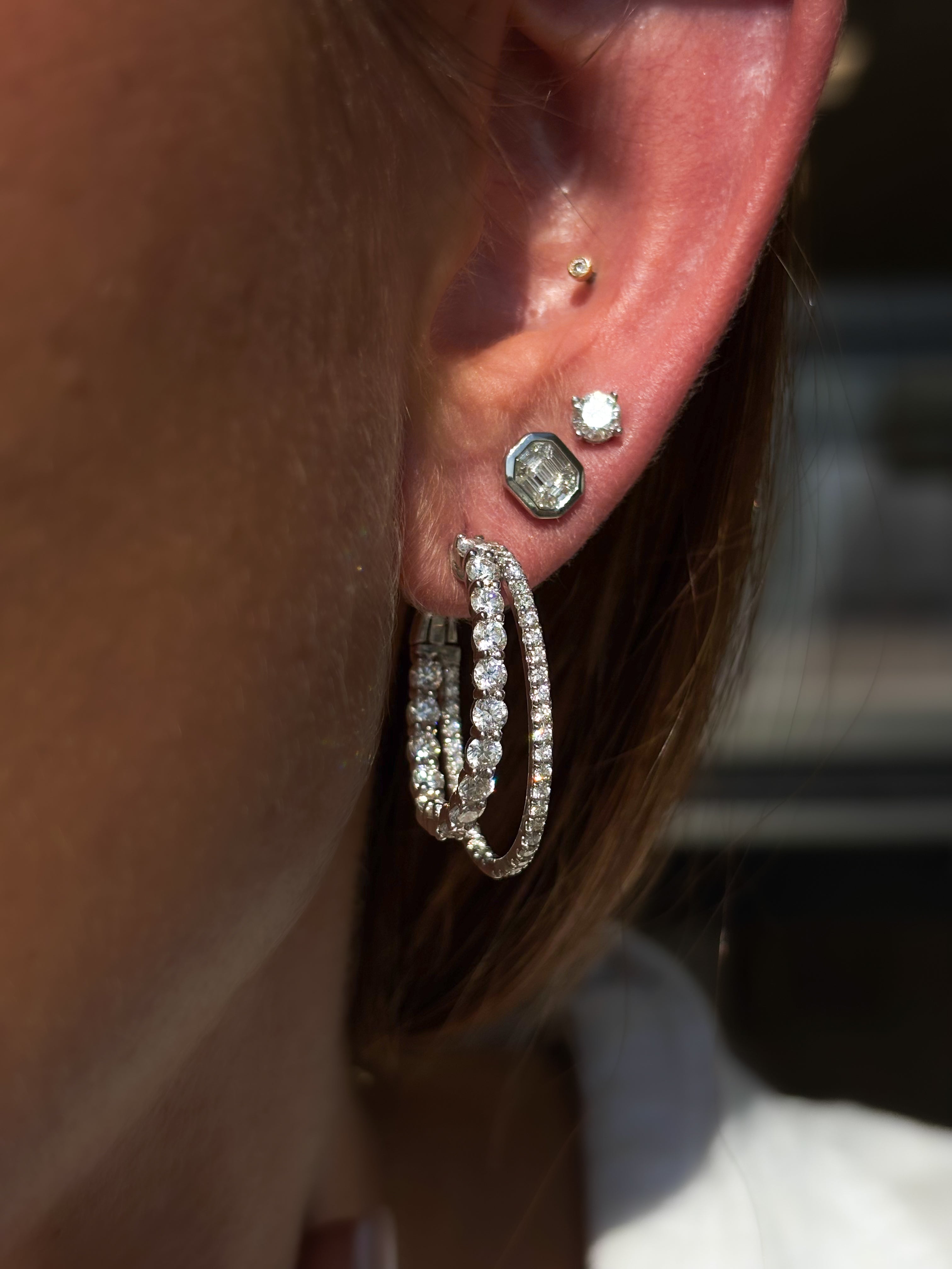 These elegant diamond hoops feature a dual-row design, combining a delicate row of smaller natural round diamonds with a second row accented by larger natural round diamonds. This distinctive style redefines the classic diamond hoop.