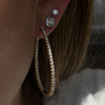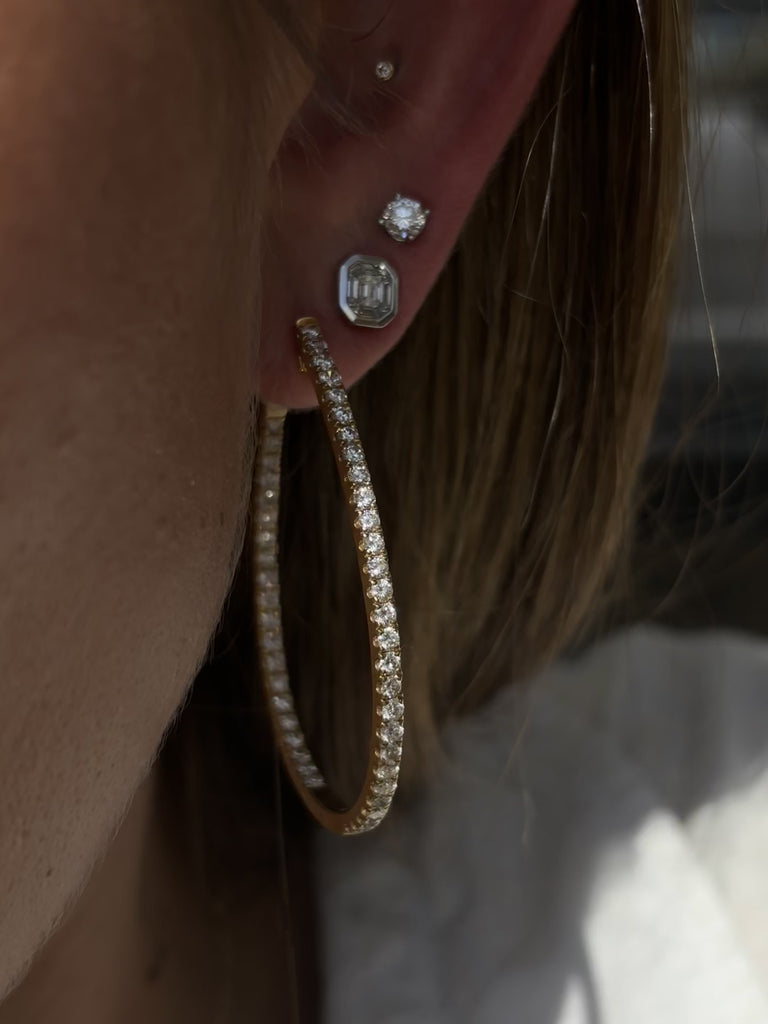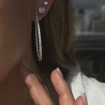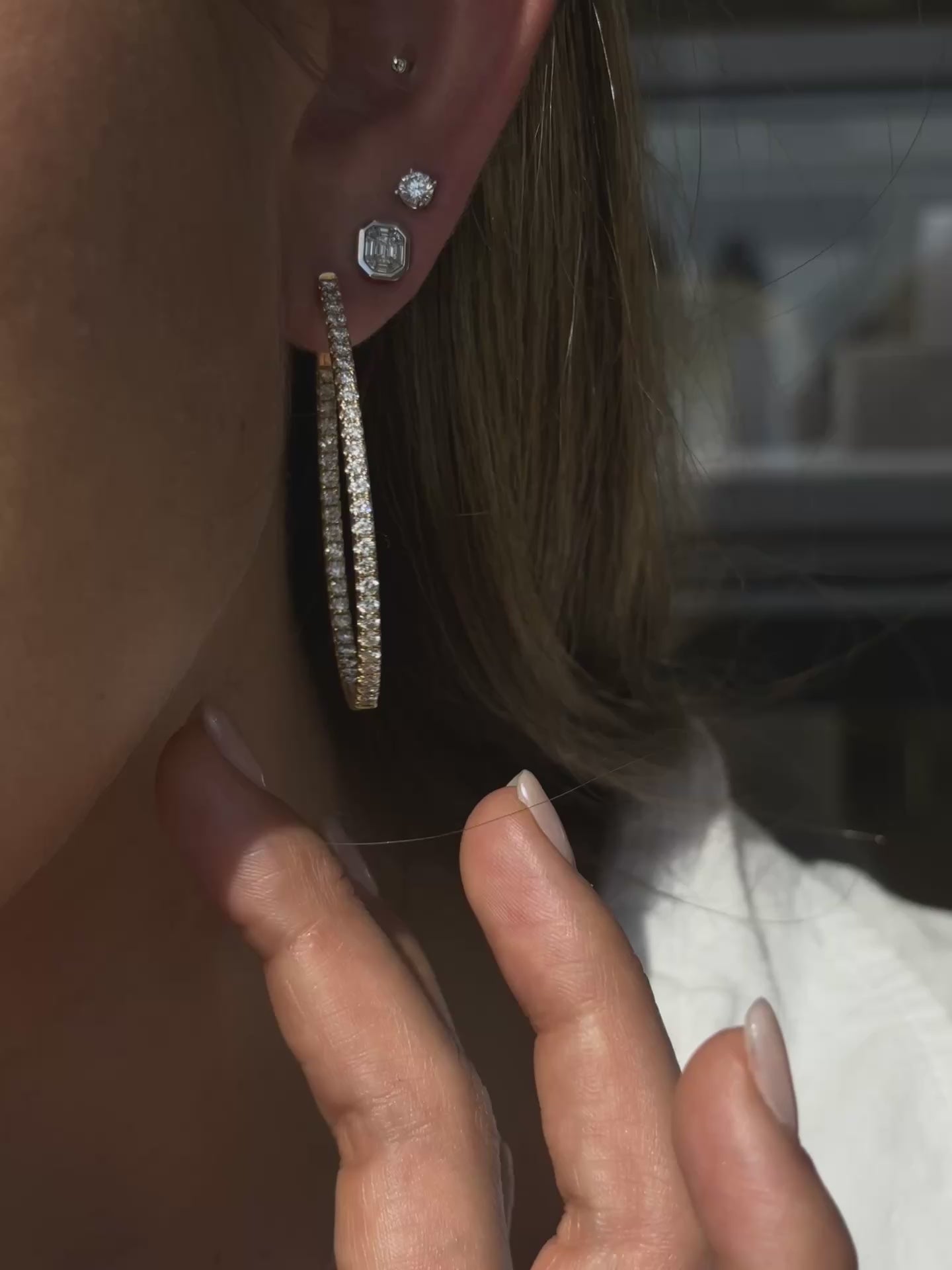 These substantial natural diamond hoops showcase diamonds set along both the inner and outer edges. Viewed from the side, they create a distinctive tear-drop silhouette, offering a refined twist on a timeless style.
