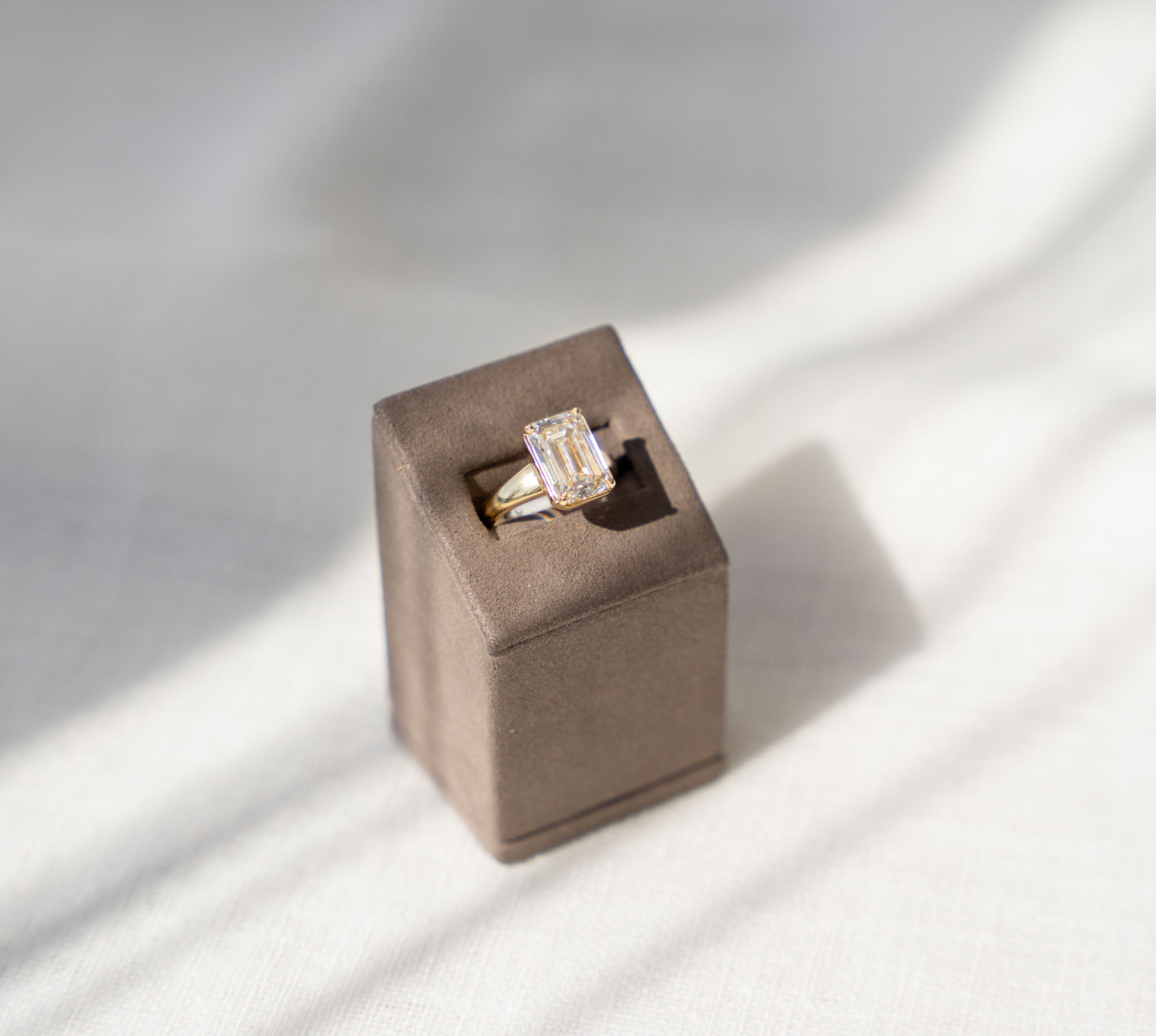 A striking 5.09ct lab grown emerald cut white diamond commands attention in this refined ring, anchored by four corner claw prongs and nestled in sunken bezel of warm yellow gold. The band's generous width gracefully narrows toward the base, delivering a modern interpretation of timeless elegance. This piece balances bold presence with understated sophistication, ideal for those who appreciate contemporary luxury with classic sensibility.