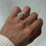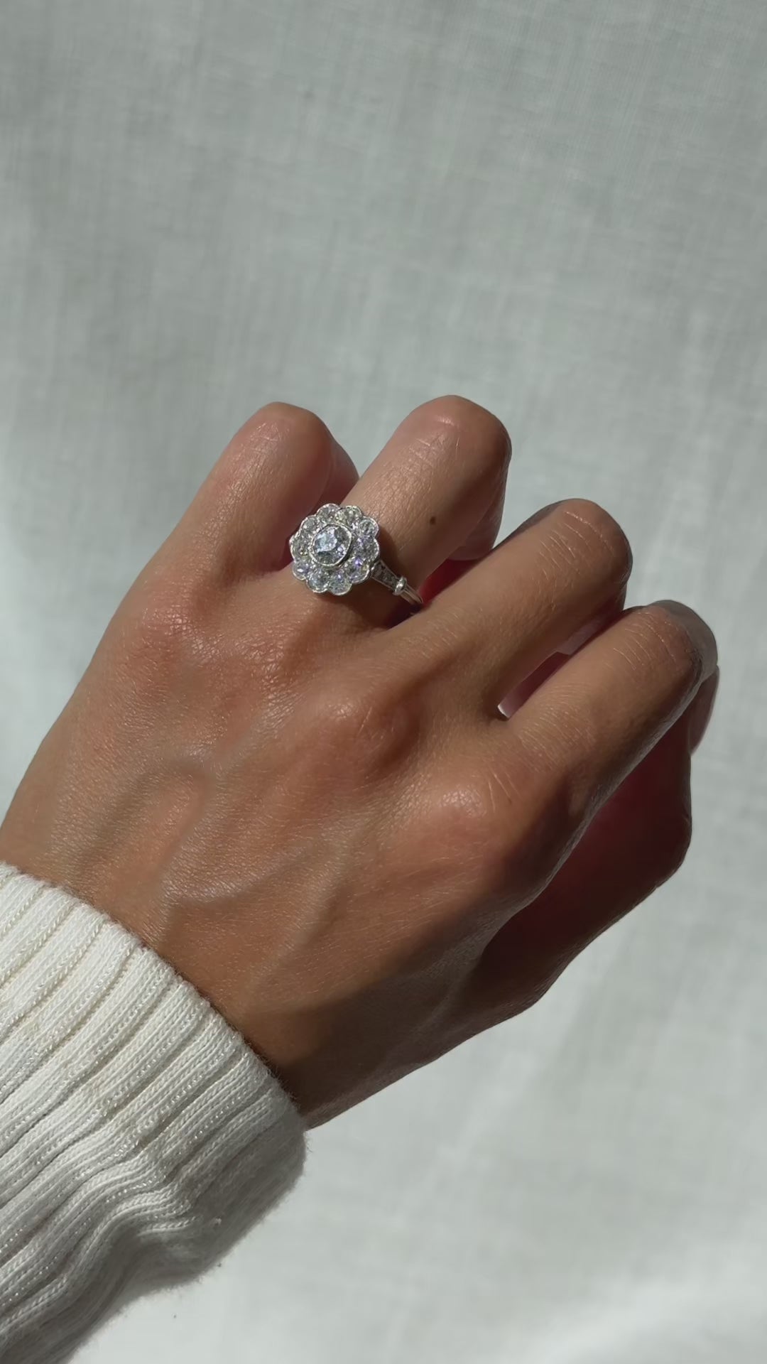 Wow! is the best way to describe this gorgeous ring - we dream about this ring often! The center old mine cut is truly perfect, exhibiting old-world charm and fairytale sparkle only found in vintage cut diamonds. Let's not forget,  she is surrounded with a beautiful scalloped arrangement of old Europeans cut!