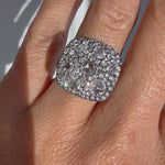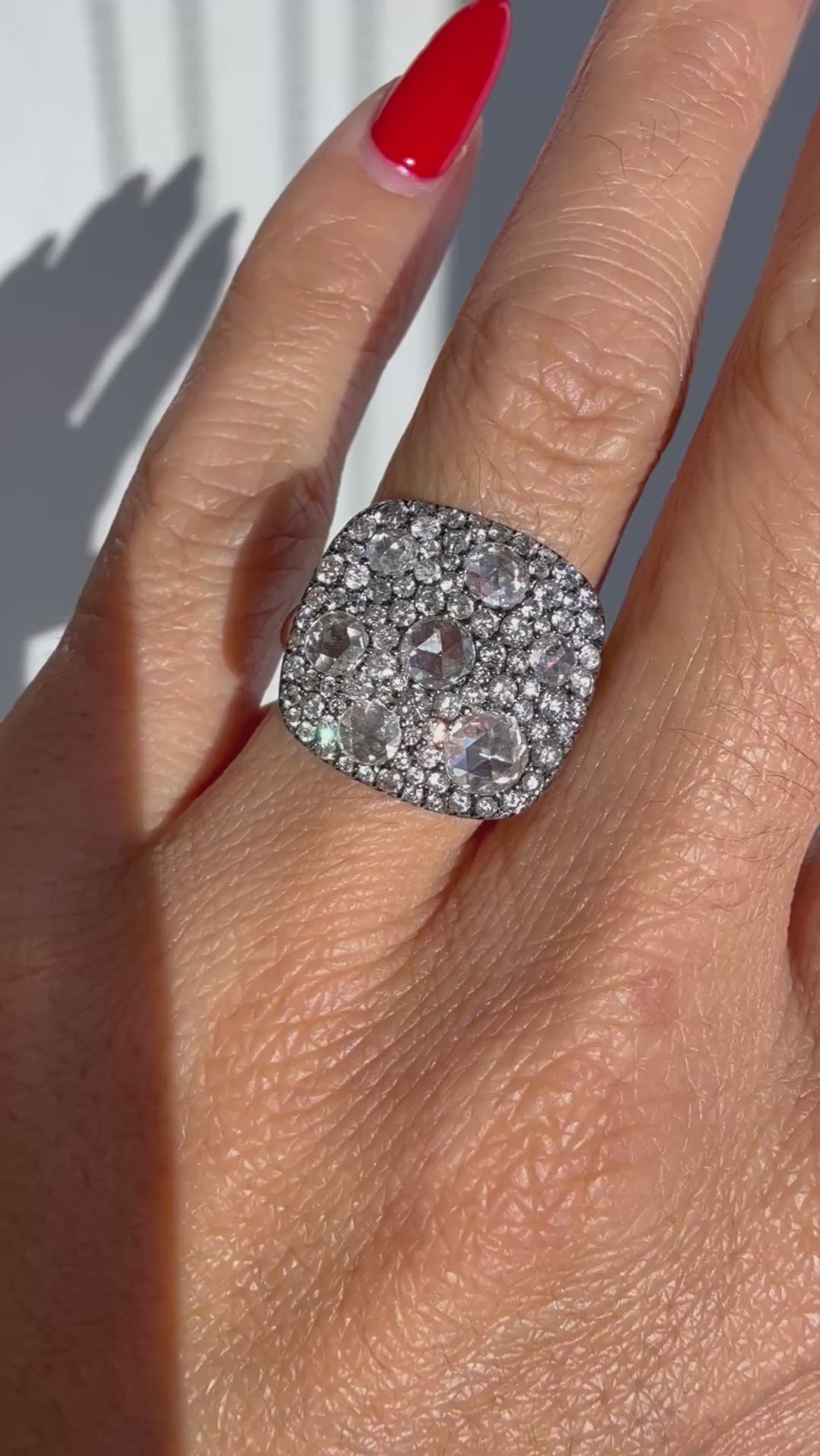 Playful cluster ring with a mixture of crystal clear rose cuts, grey diamonds all set on a black rhodium backdrop!  This stunningly stylish and unique ring is sure to spark conversations - it's sure to be a standout accessory in any wardrobe!