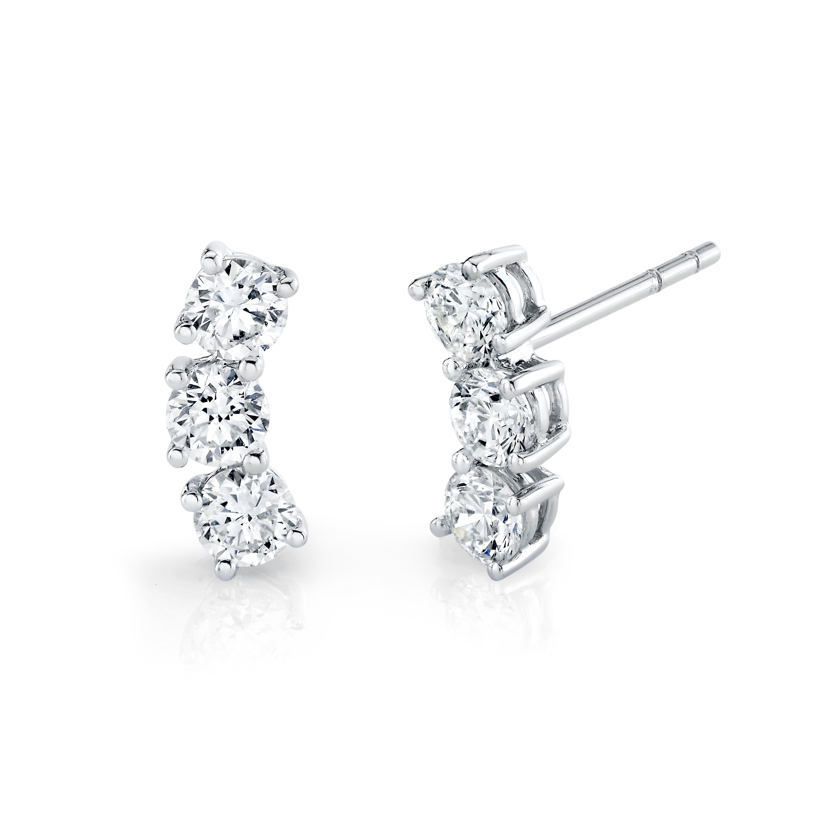 These elegant studs each showcase three natural round white diamonds arranged in a graceful arc that complements the ear's contours. Mounted in white gold, each stone is positioned to maximize its brilliance and visual impact. Versatile enough for a single piercing or layered across multiple piercings, they offer refined sophistication for any occasion.
