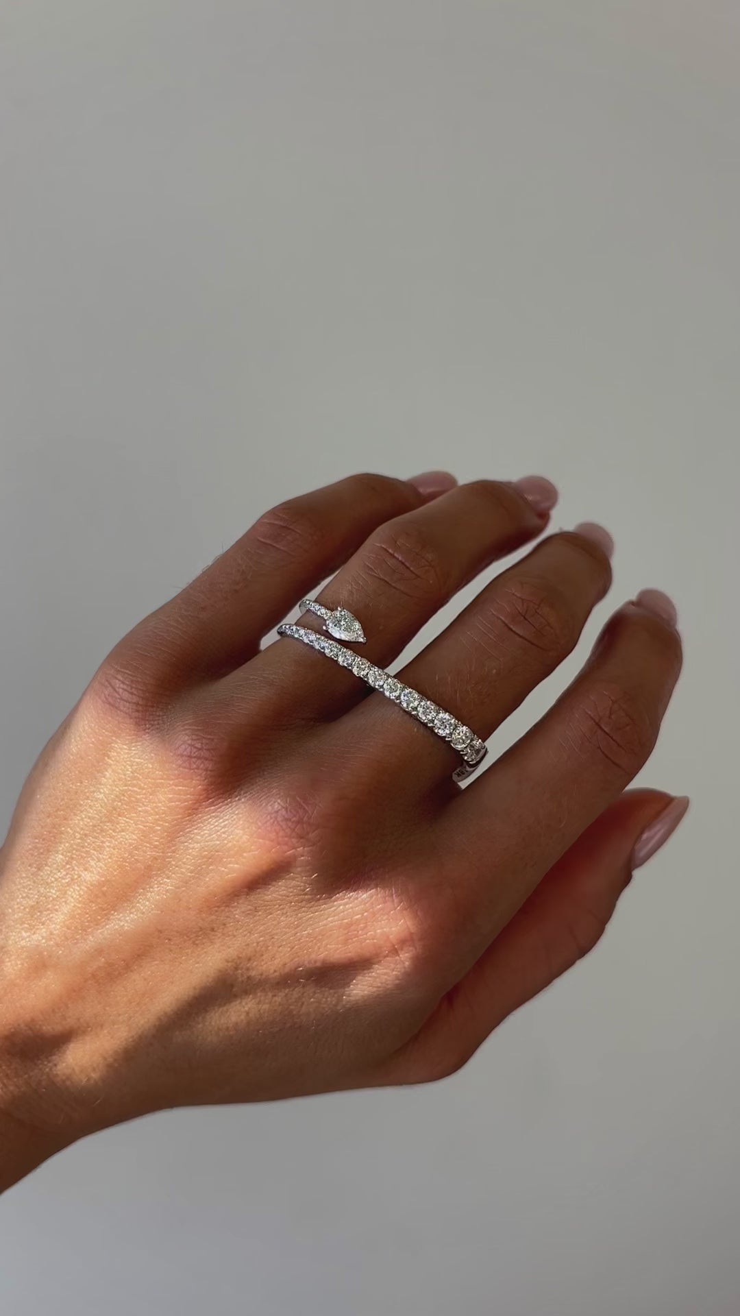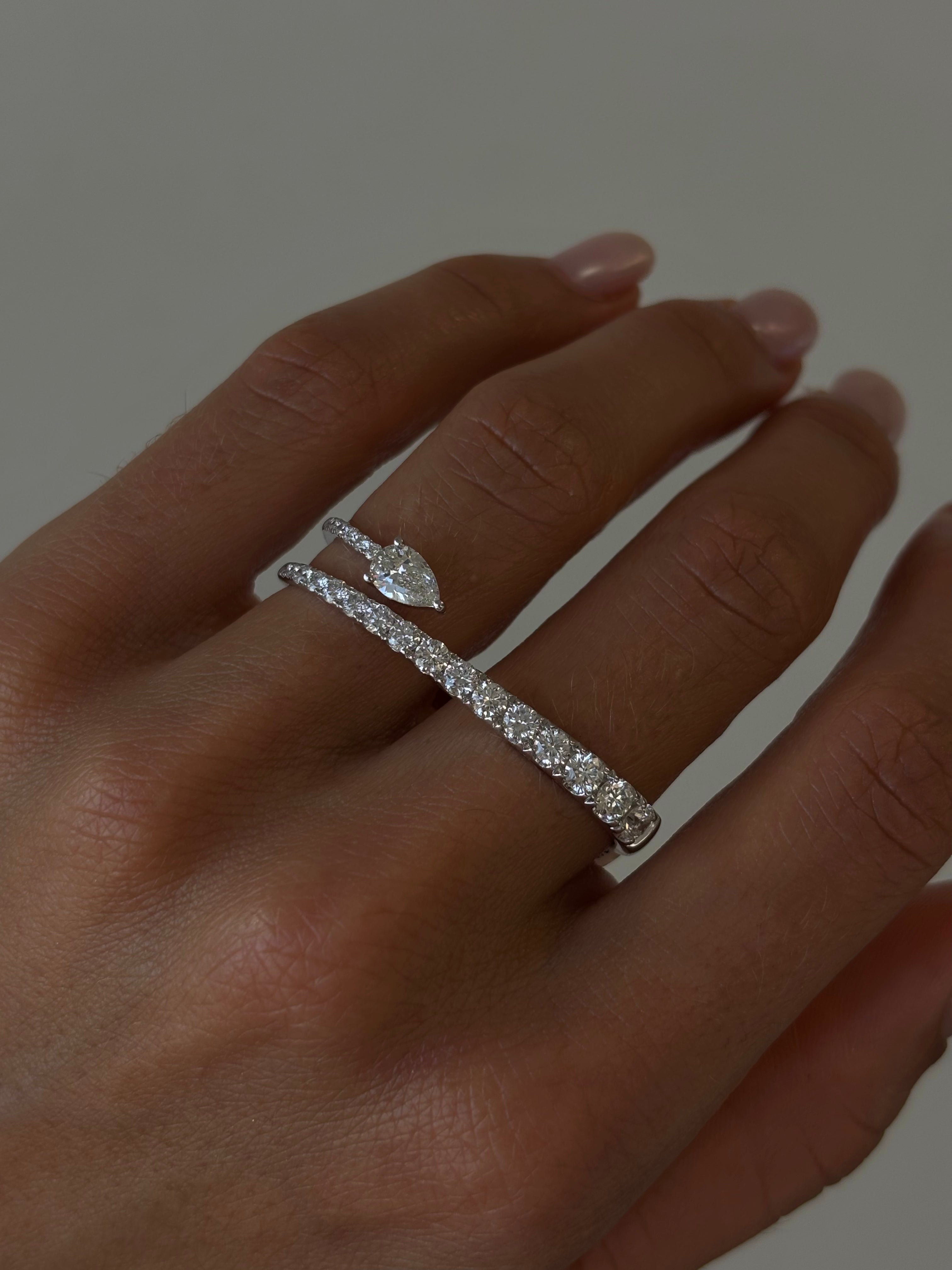 This striking two-finger ring showcases a modern aesthetic with natural round white diamonds that gracefully wrap around both fingers, culminating in an elegant pear-shaped diamond end stone. A sophisticated statement piece that balances refinement with an unmistakable edge, perfect for the woman who embraces contemporary luxury with confidence.