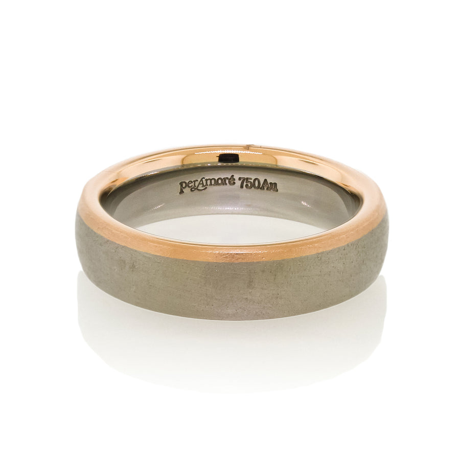 This wedding ring is for a guy who wants a classic wedding ring with a subtle design distinction. A unique design by Per Amore, made exclusively for Harold Stevens in San Diego. Crafted in 18K white gold featuring an offset line of 18K red (rose) gold, and finished off with a detailed granular outside surface.