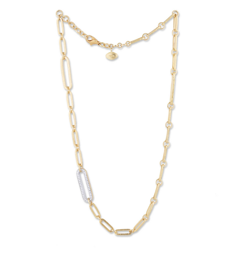 The oversized double-sided diamond link is the centerpiece of the chain, and features sparkling diamonds set in a captivating off-set design.