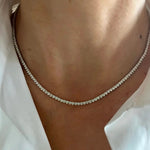This 14k white gold tennis necklace features 4.28 carats of natural round brilliant diamonds, each secured with a classic 3-prong setting. Its timeless design radiates elegance, making it perfect for layering or wearing alone. It also never flips so the diamonds are always sparkling!