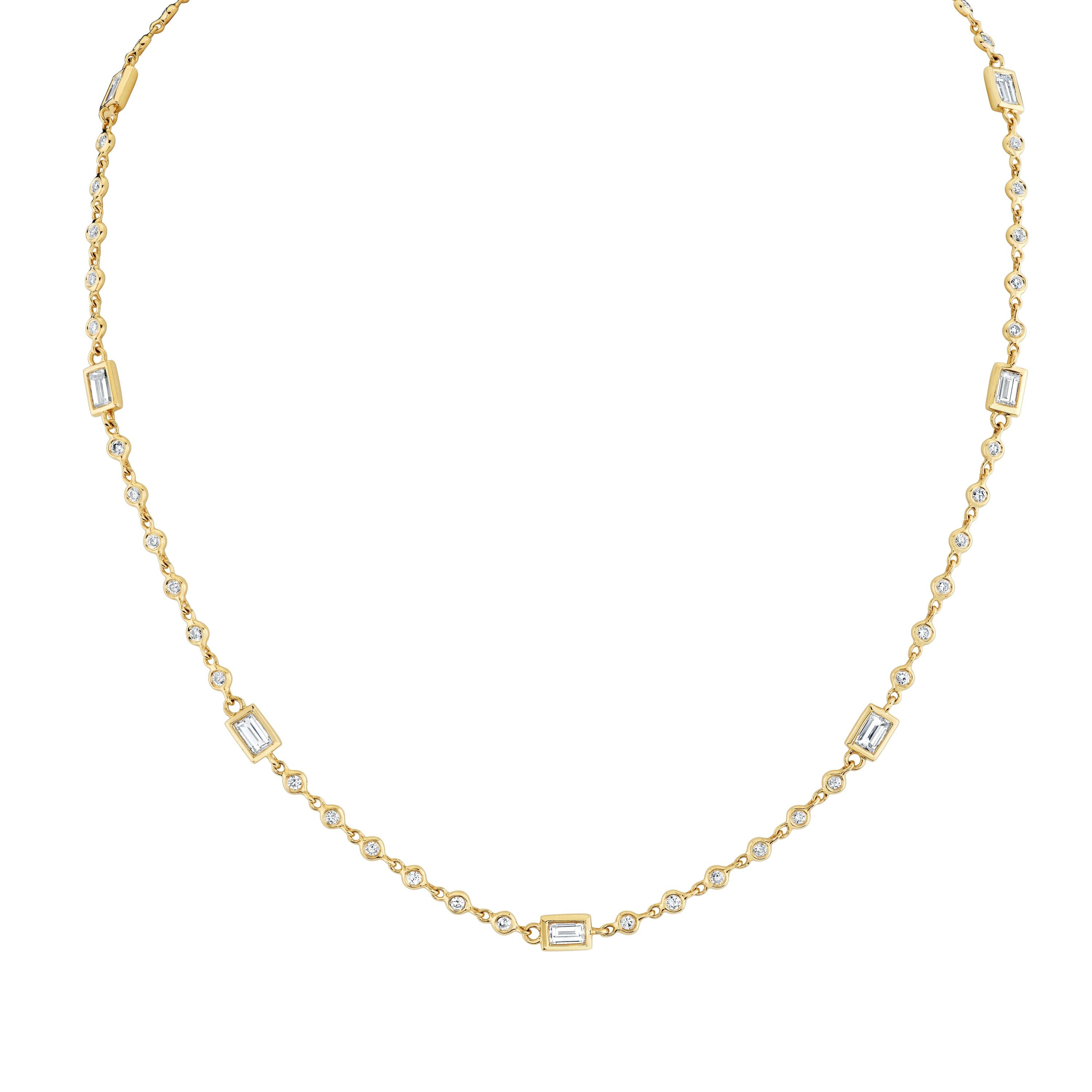 This elegant necklace reimagines timeless sophistication through thoughtful design. Fifty-two natural round diamonds, each secured in a bezel setting and linked with polished yellow gold, form the foundation of the piece. Nine strategically placed natural emerald cut diamonds punctuate the design, introducing subtle geometric contrast and visual depth. Designed for everyday elegance, the necklace drapes gracefully along the neckline and serves as an ideal foundation for layered styling or as a standalone statement.