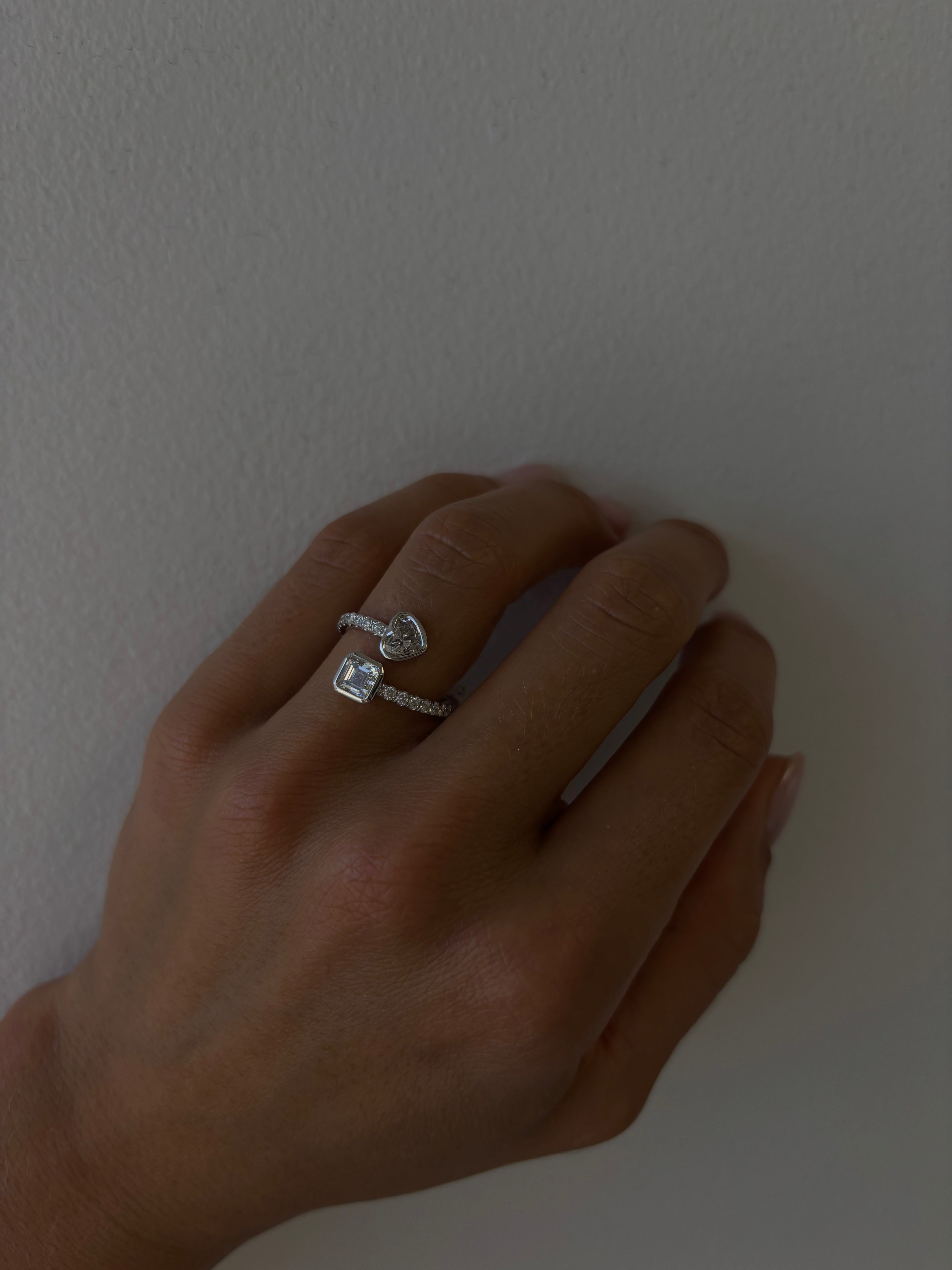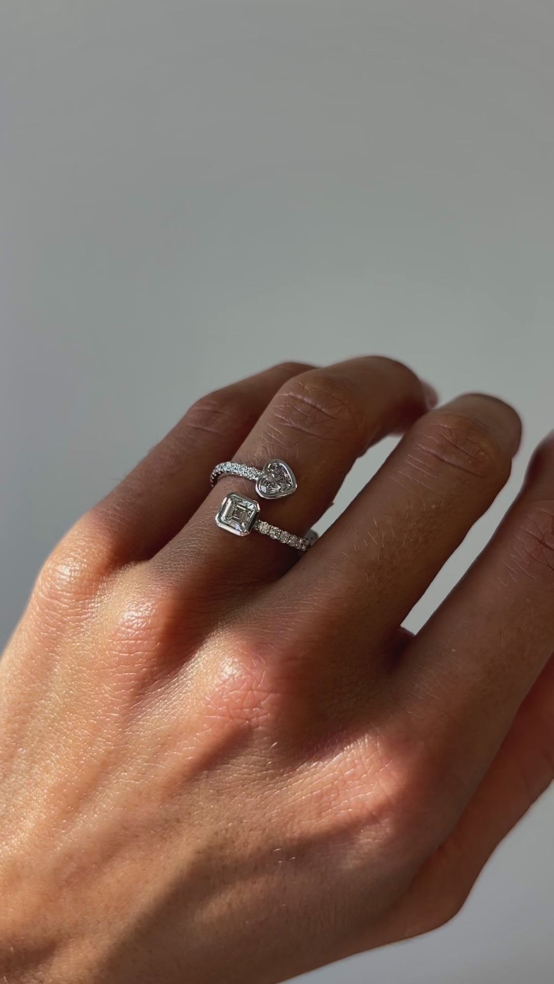 Experience sophistication and playfulness with our Crossover Diamond Ring. This dramatic yet understated design combines all natural diamonds, including a heart shape and square asscher cut, for a unique and luxurious look. Perfect for any finger!