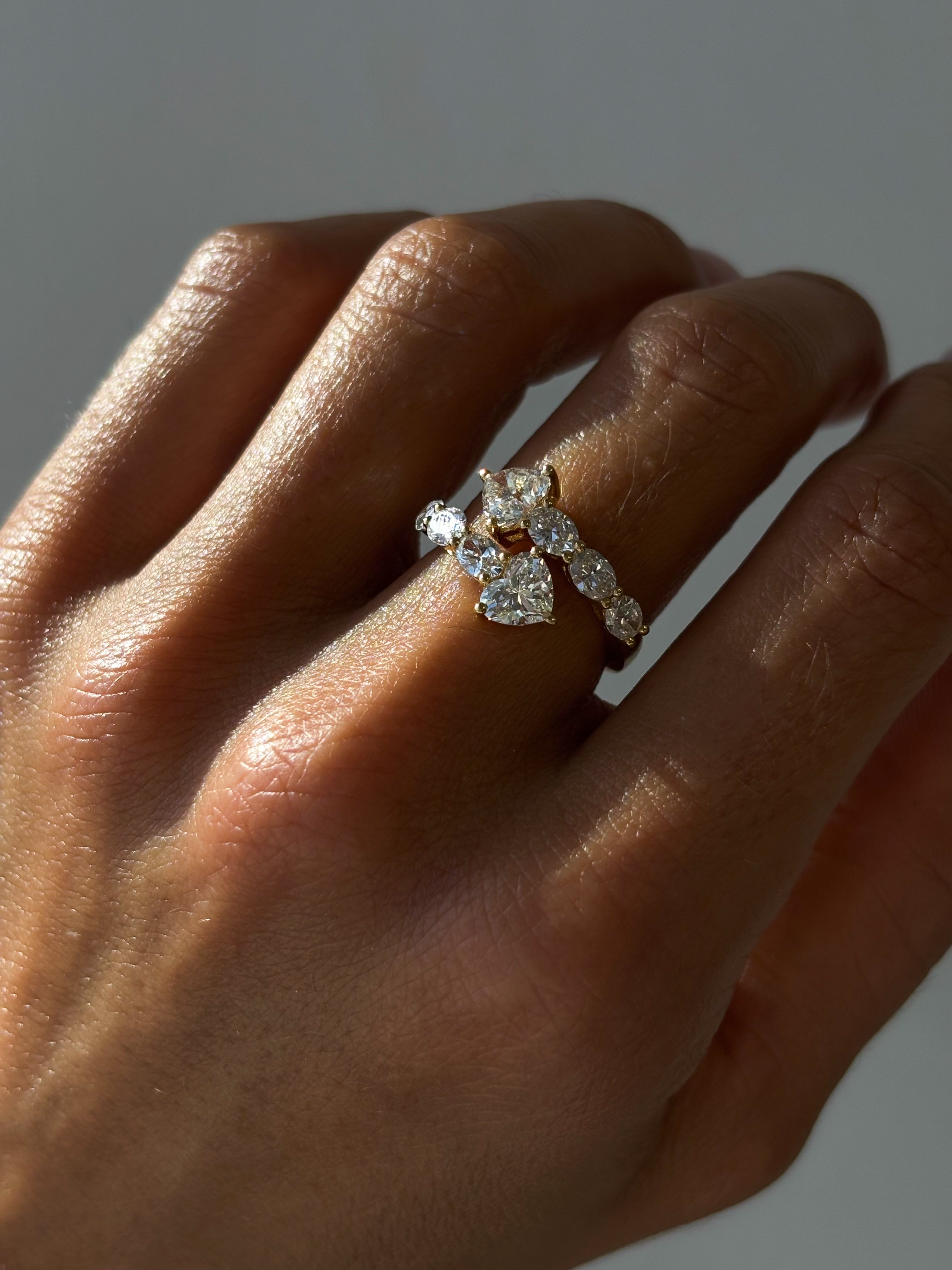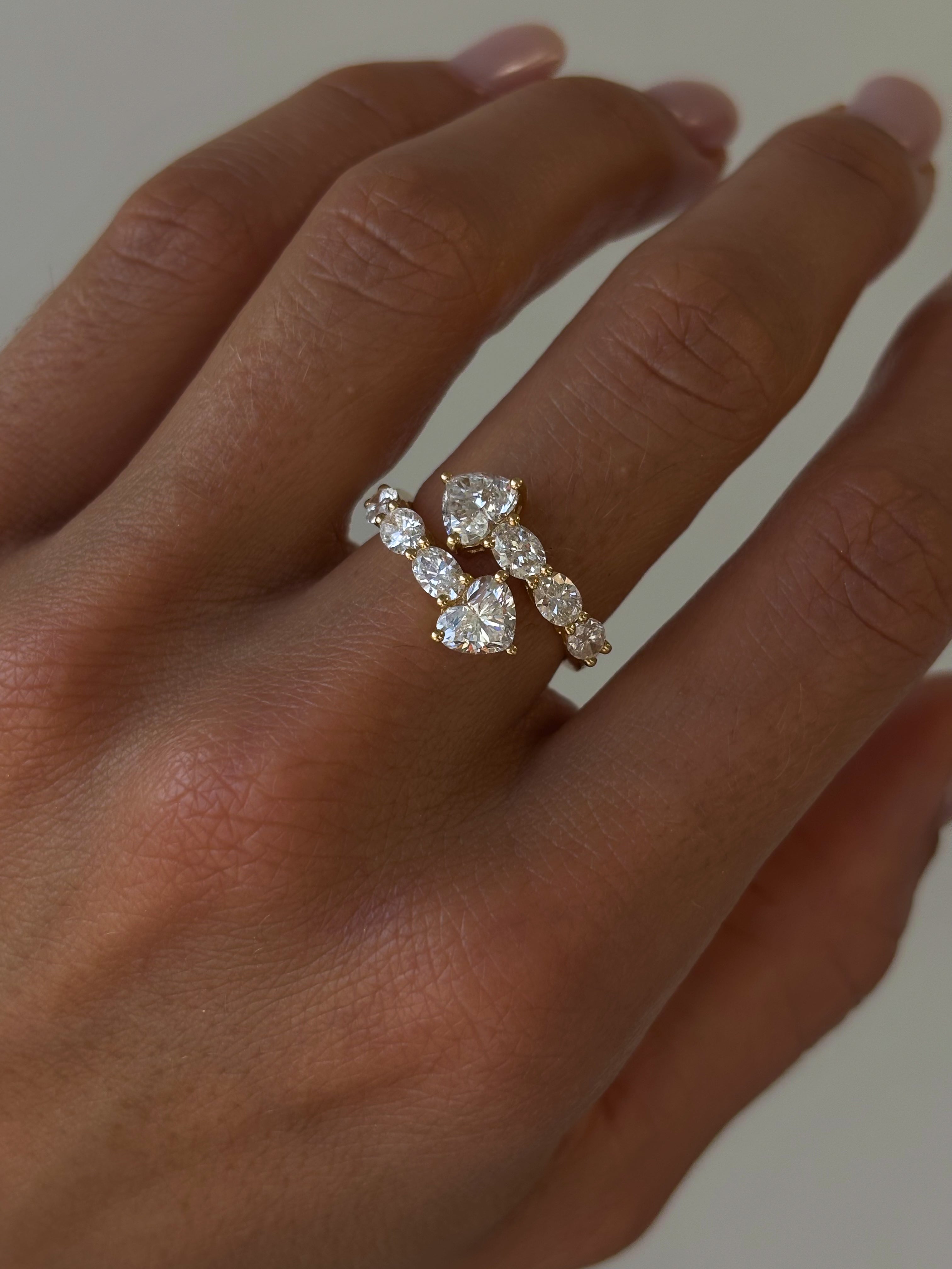 Introducing our Heart Shape Diamond Cross Over Ring - a perfect combination of elegance, sophistication, and drama. This distinctive design features two stunning natural heart shaped diamonds weighing almost 1.50 carats, paired with precision matched oval cut diamonds. A must-have for anyone looking for a unique and timeless piece of jewelry.