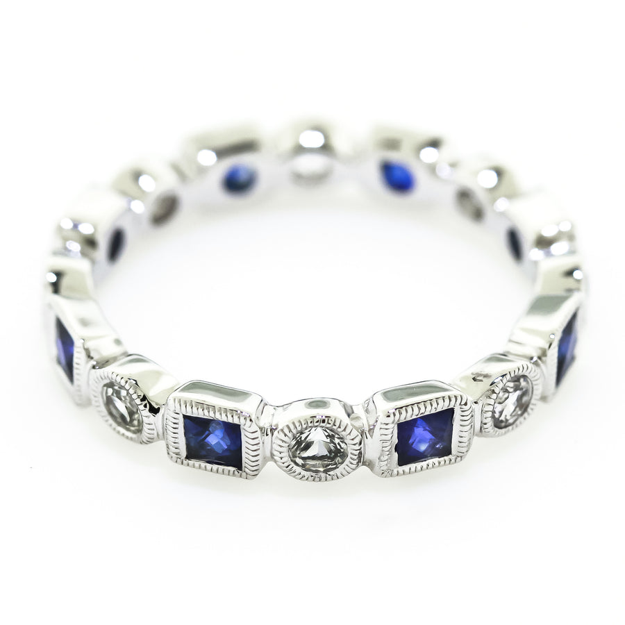 Alternating Blue and White Sapphire Eternity Wedding Band Crafted in 14K White Gold. The Ring Contains 0.70 Carats in Total Weight of Strong Blue Sapphires and 0.50 CTW Round White Sapphires.
