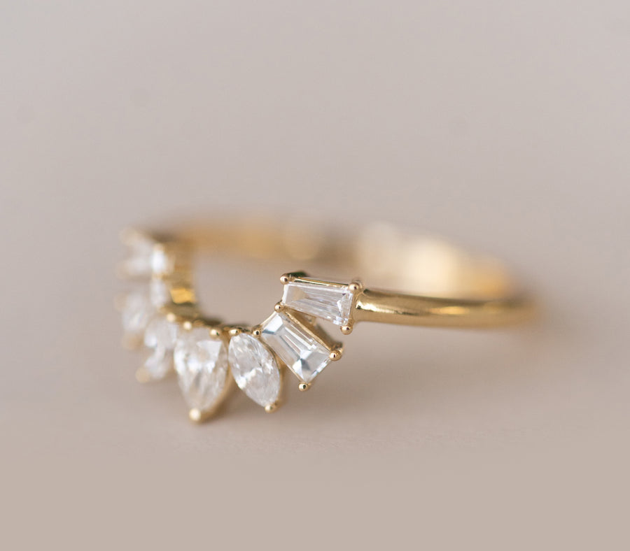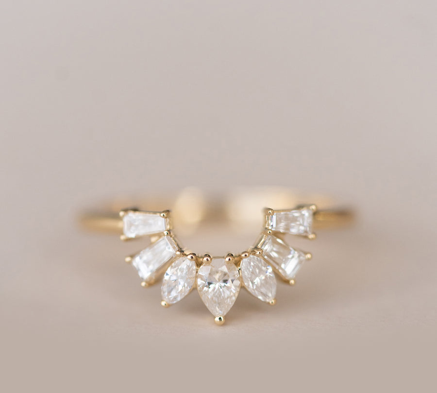 A beautiful nesting diamond band inspired by our beautiful California sunbursts or sunrises depending upon your lifestyle choices! The subtle contour on this band fits effortlessly with most engagements and can even be used as a stackable band!
