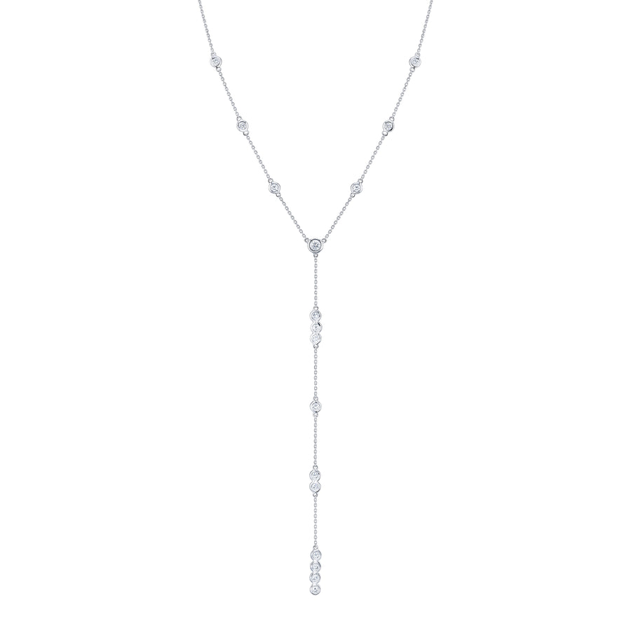 Multi-station diamond lariat necklace in its simplest form, no need to wrap to this necklace multiple times. It contains a hidden clasp at the back and allows for an effortless look!