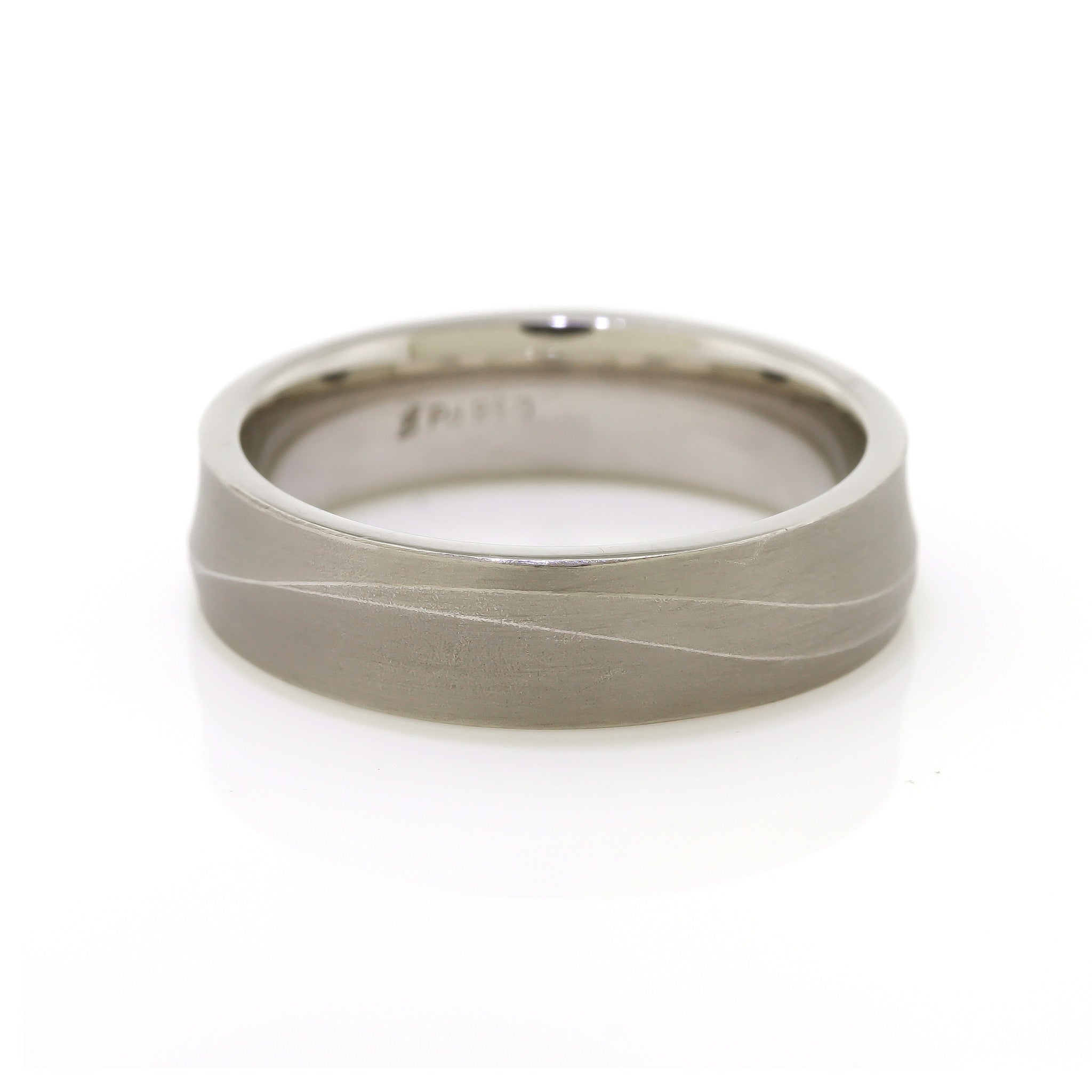 Harold Stevens exclusive men's wedding band with a sleek design crafted in Palladium with a super fine sandblast finish and wave-like pattern. The ring is low-profile, comfortable to wear, and stylish.