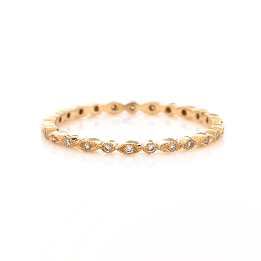 Perfectly petite 14k rose gold diamond band. The ring contains round brilliant cut diamonds set with micro prongs, and highlighted with filigree border details. A fantastic wedding band option, or add this to any stack-able ring ensemble.