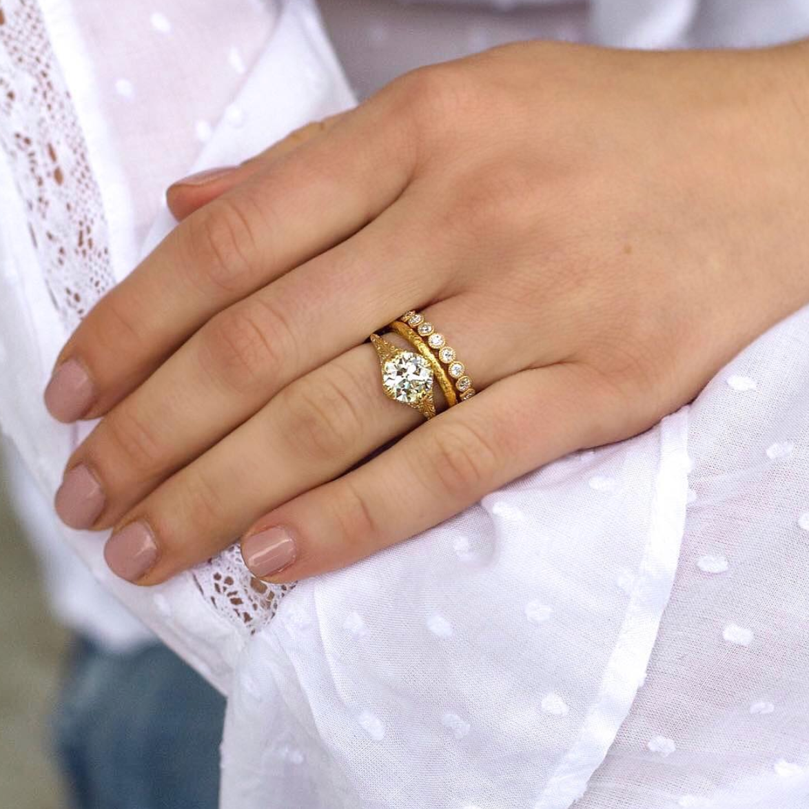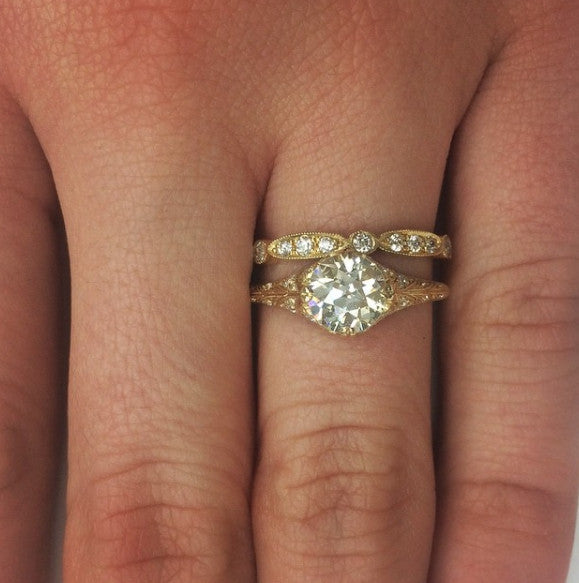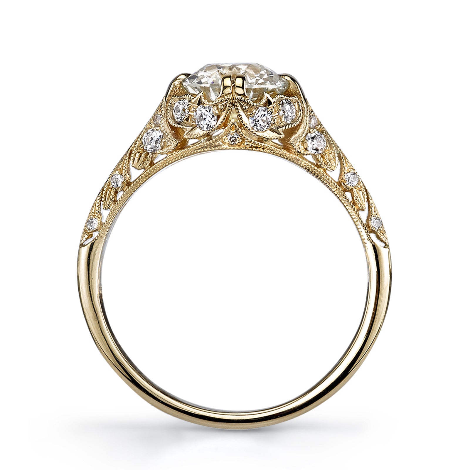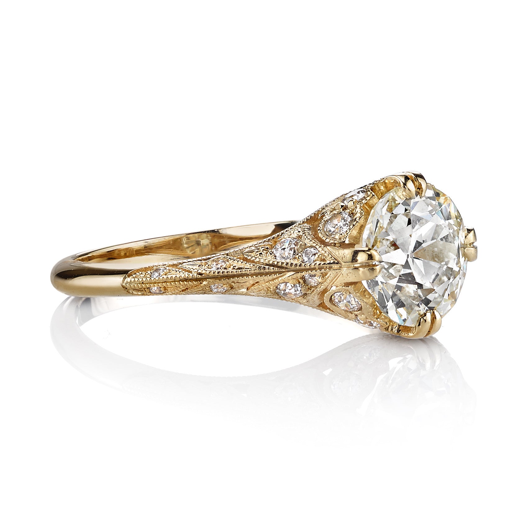 Hand-crafted 18K yellow gold engagement by Single Stone, named Charlotte. A charming setting rich with intricate details reminiscent of the Edwardian era. The ring is perfect for those looking for something with stylish that is adorned with tiny filigree details. The center diamond is a classic Old European cut with great brilliance, chunky facets and exceptional fire. The ring contains 2.24 carats in total diamond weight.