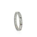 Crafted in Todd Reed's signature textured palladium, this substantial wedding band features a series of white round brilliant cut diamonds burnish-set with the metal band.  Faceted black diamond accents has been interspersed throughout the eternity band, adding just the right amount of dramatic flair.